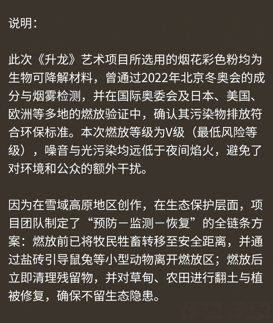虽然主办方在事后声明中称,活动经过“科学评估和严格指导”。但这种泛泛而谈的说法,缺乏具体细节和第三方数据支持,难以平息公众质疑。当媒体询问北京蔡国强艺术工作室关于环保争议时,其一句“用的是环保材料”,便想将公众的质疑轻描淡写地打发过去。当被追问火药对当地动植物的影响时,工作人员一问三不知;当媒体询问当地有关部门时,得到的回答是活动备案且手续合规,并且也强调了“使用环保材料”。